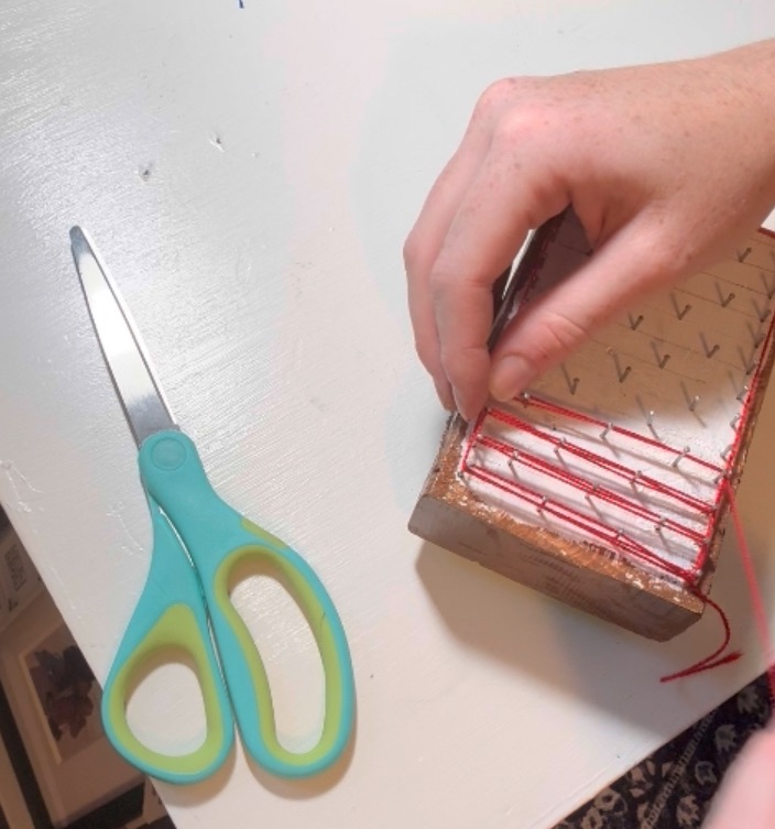 Tie the end of your string to one of the nails, then weave it around the nails to fill in your design. For the 4th of July, use red, white, and blue string. For the sunflower, yellow for the petals and brown or black for the center.