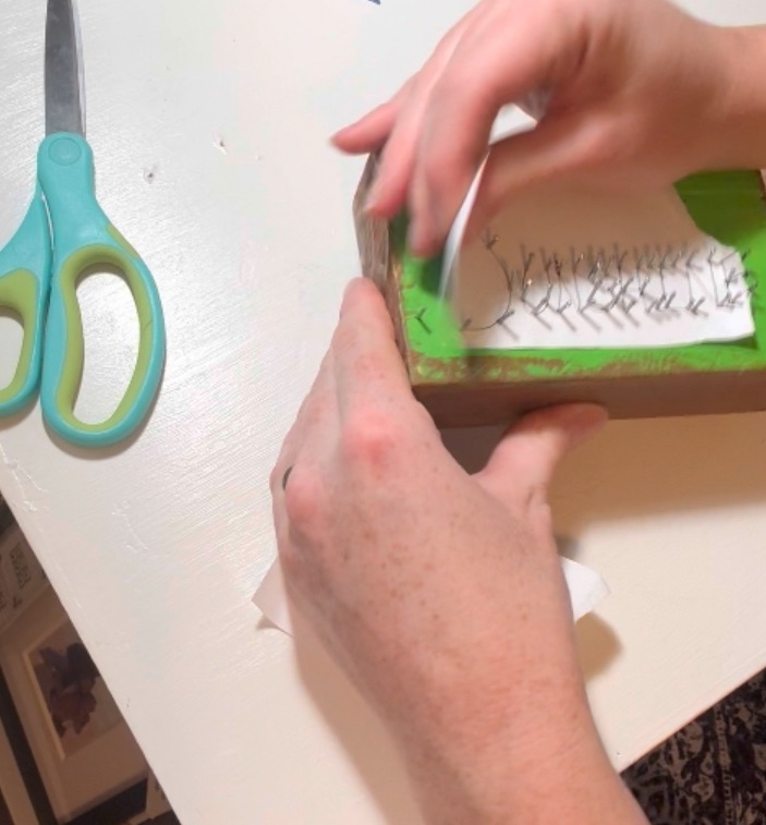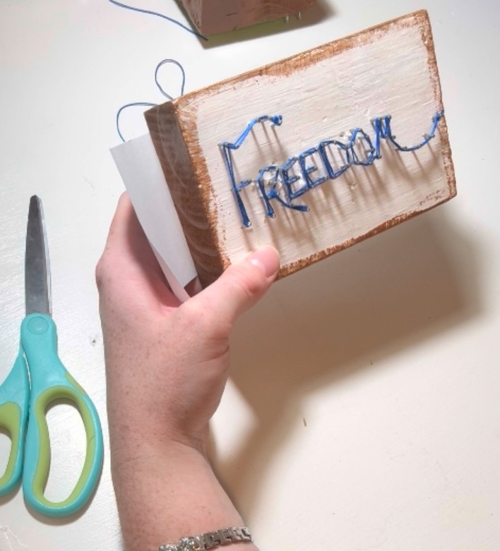 Lightly trace your chosen designs onto the painted blocks with a pencil. For the 4th of July side, you might sketch out a star, a flag, or fireworks. On the reverse side,cheerful sunflower or flowers, then I’m doing the word Sunshine. I just wrote the words on a piece of paper nailed it right on like a template then tore the paper off after the nails are in.