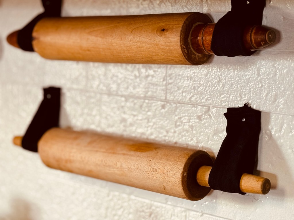 - Once the loops are attached to the wall, you can easily slide the handles of the rolling pins into the loops. The pins should hang horizontally, looking neat and accessible.