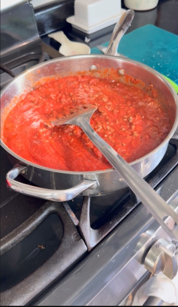 - Spread a thin layer of meat sauce at the bottom of a 9×13 inch baking dish.