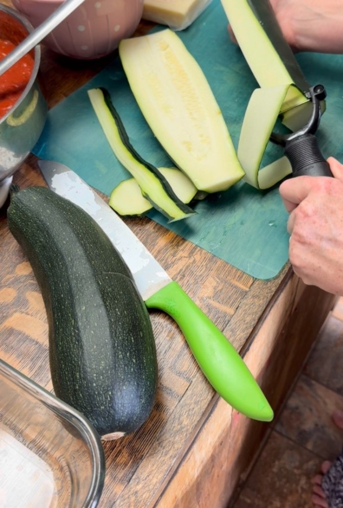 - Slice the zucchini lengthwise into thin strips, about 1/8 inch thick. If you have a mandoline, this tool works perfectly for even slices.