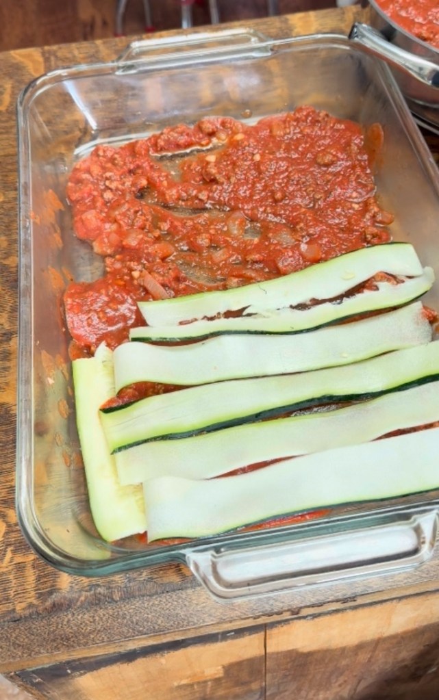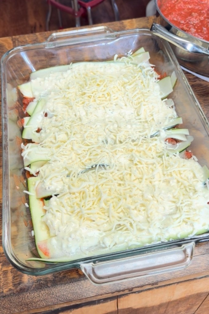 - Spoon a layer of the cottage cheese mixture over the zucchini.