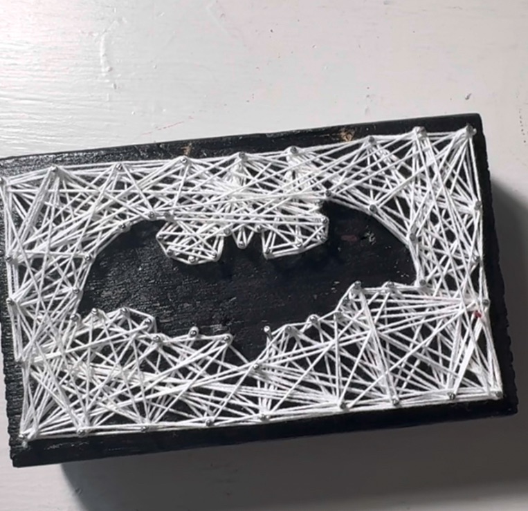 For the Batman side, I wanted to focus on the clean, bold lines that symbolize his unwavering determination. I began by outlining the Batman symbol—strong and iconic, it didn’t need much embellishment. Once the outline was nailed in, I used white string to fill in around the symbol. The choice to use white over black emphasizes Batman’s role as a beacon of hope amidst Gotham’s darkness, making the symbol pop against the backdrop.