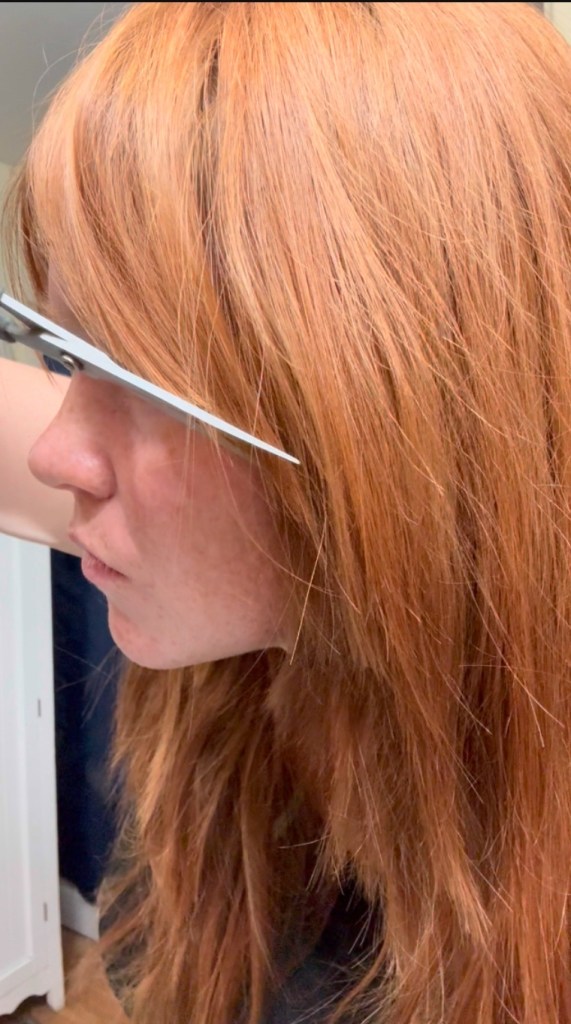 With the bulk of the cutting done, my next focus was blending. Since the ponytail method tends to leave blunt edges, I just kept trimming little by little until the layers came together more naturally. I concentrated on the sections around my face, blending my bangs into the longer layers so everything flows.