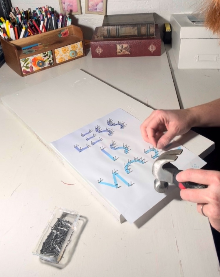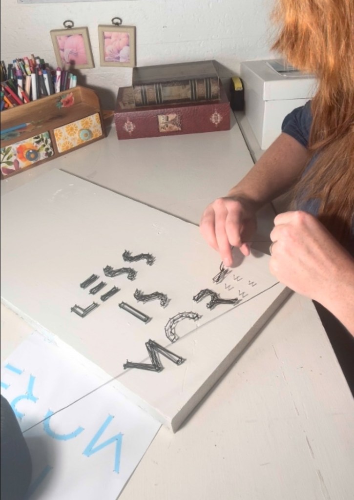 3. Add the Nails and String: I placed nails around the outline of each letter, spacing them evenly to keep it clean. Then I used a simple, neutral-colored string to fill in each letter, being careful not to make it too dense. The open, airy design matched the phrase perfectly.