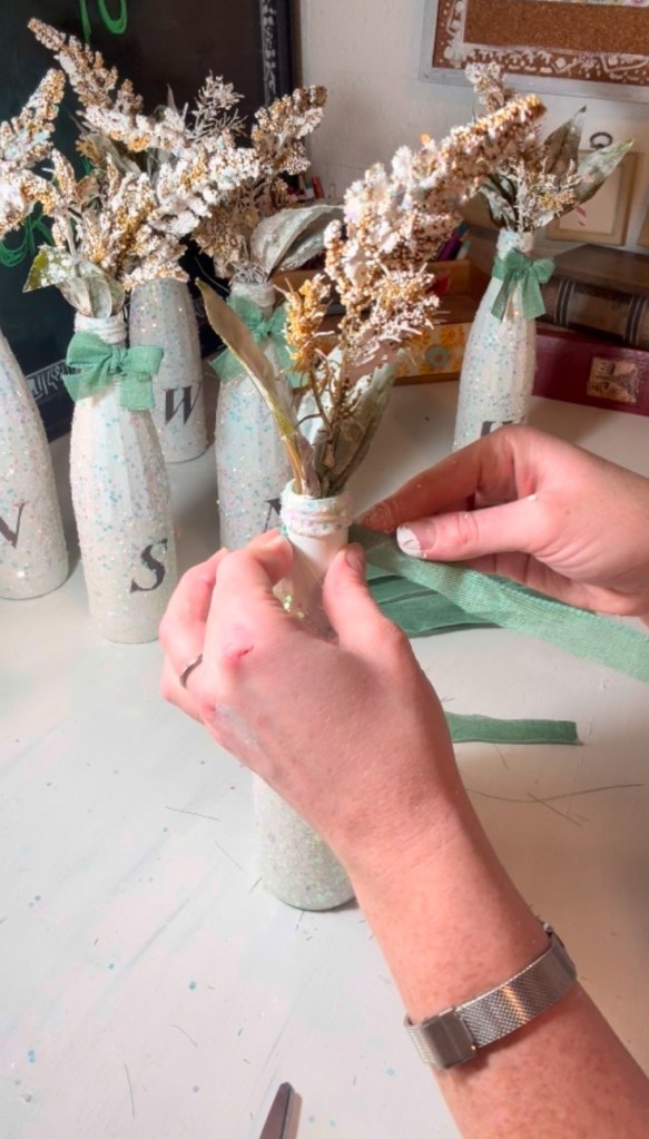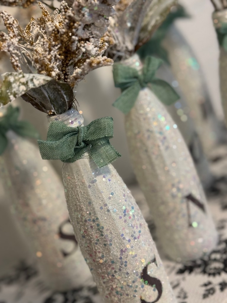 Once everything was dry, I tied a small green ribbon around the neck of each bottle for a subtle pop of color. This simple detail brought the entire look together without overpowering the snowy aesthetic.