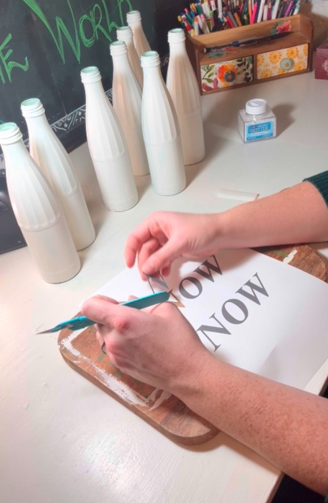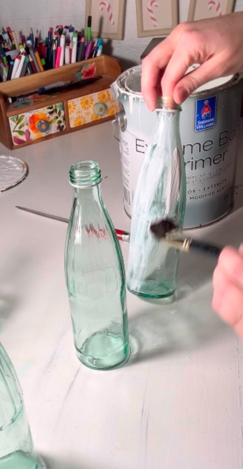 Start by cleaning your bottles thoroughly to remove any labels, dust, or grease. Then I painted the bottles first with primer then a layer of paint.