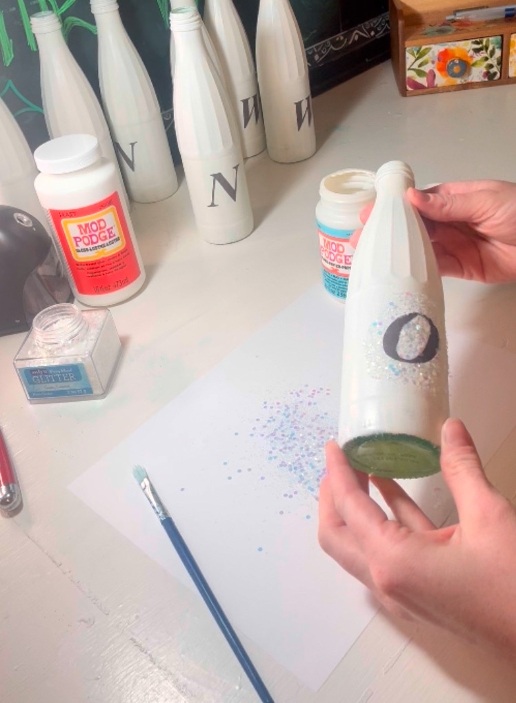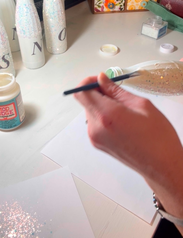 Once the letters are secure, coat the entire bottle (except the letters) with a layer of Mod Podge. While the glue is still wet, sprinkle fluffy sprinkles or artificial snow all over the bottle. Tap gently to remove any excess and let it dry. This creates a frosty, snowy effect!