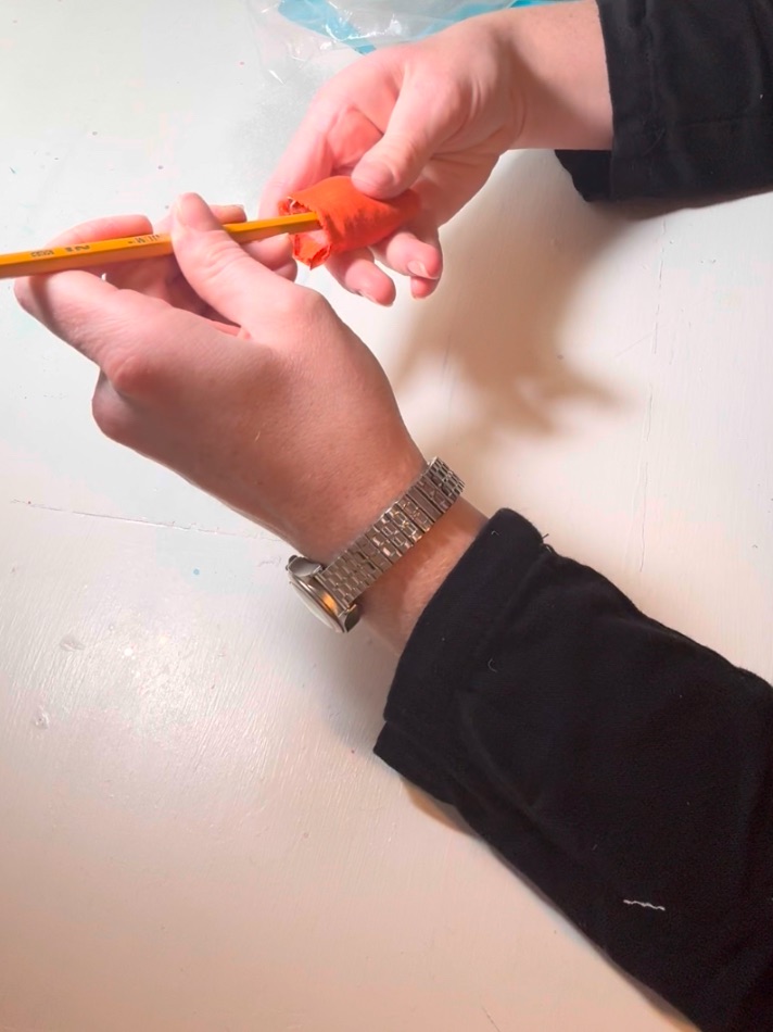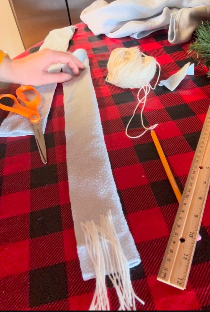 5. Attach Arms: I tied brown pipe cleaners together, inserted them into the snowman, and sewed them securely.