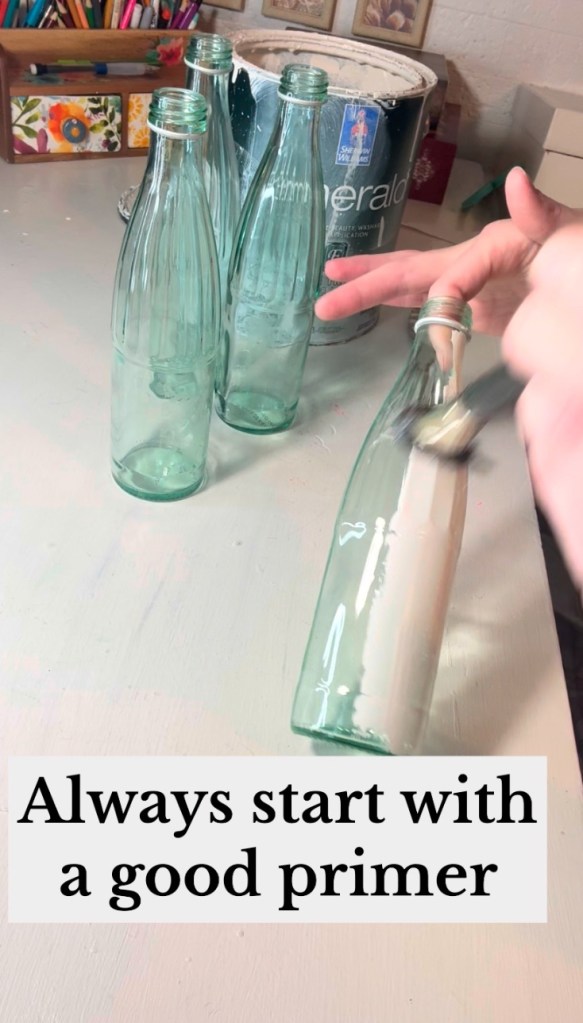 Start by thoroughly cleaning your bottles to remove any labels and residue. Once dry, apply a good primer to ensure your paint adheres smoothly.