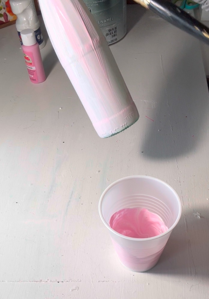 After the primer dries, paint each bottle with light pink acrylic paint. Allow them to dry completely before moving to the next step.