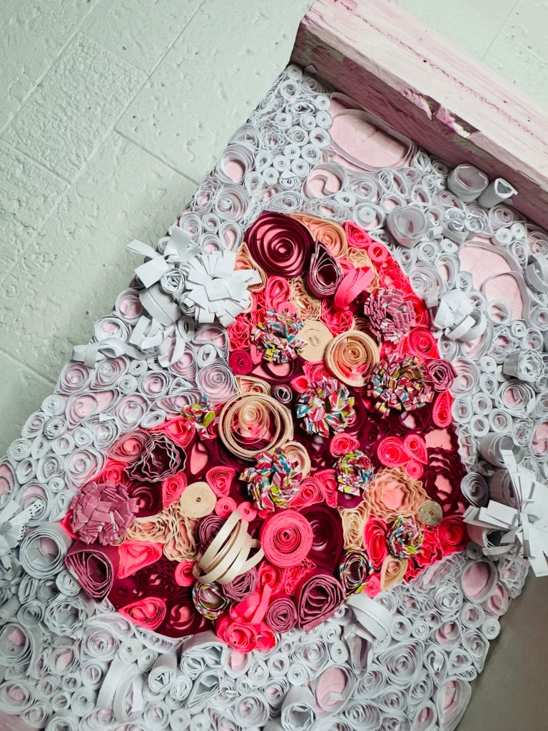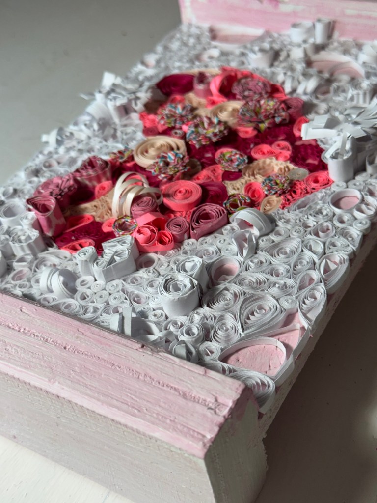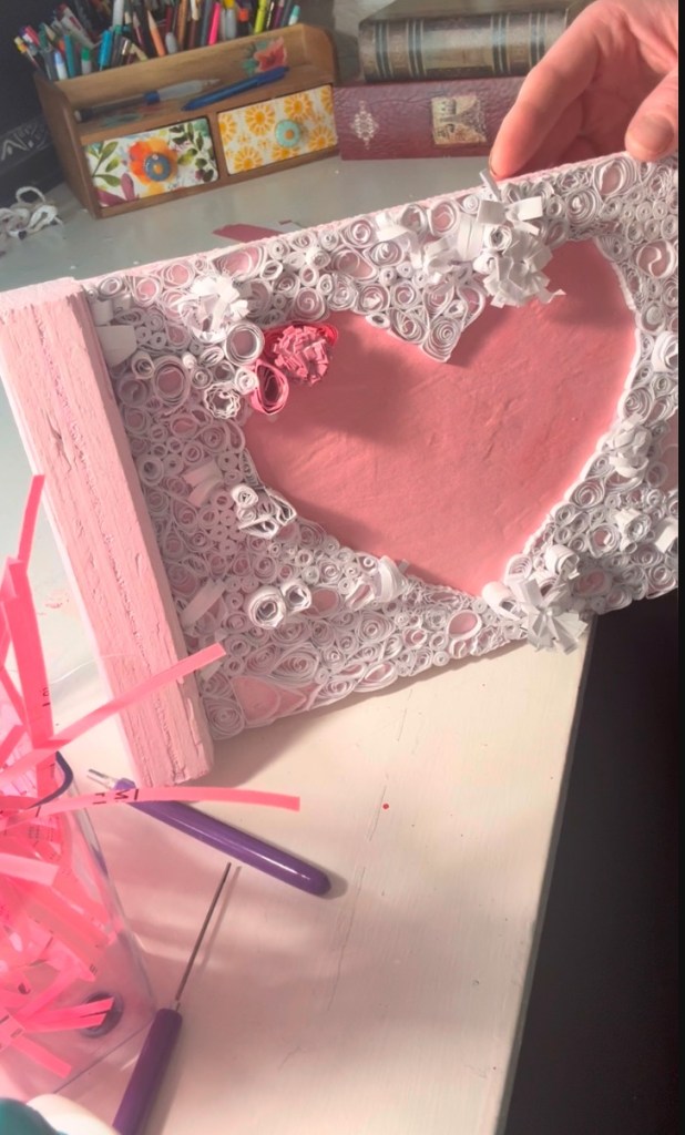 The white paper quilling added contrast and dimension, while the different shades of pink complemented the heart in the center. The combination of colors and textures brought the piece to life, giving it a whimsical yet elegant feel.