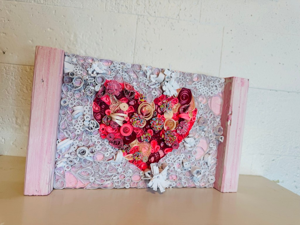 In the center of the painted wood, I glued a paper heart cut from pink paper. This heart served as the focal point of the piece and inspired the rest of the design.