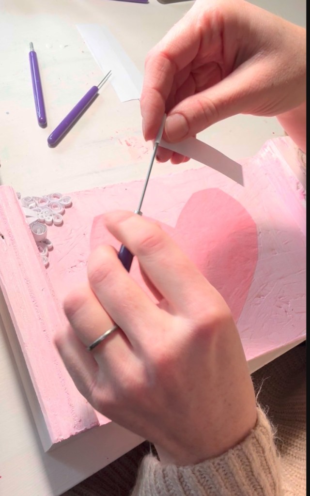 With the base prepared, I began the fun part: quilling! Using strips of paper in white, I created an assortment of shapes—tight coils, teardrops, and scrolls—to form intricate patterns around the heart.