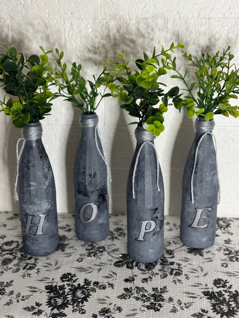 To personalize the bottles, I printed the word “HOPE” in a stylish font and carefully cut out each letter using a craft knife. Once the letters were ready, I adhered them to the bottles using Mod Podge. After the Mod Podge dried, I painted over the letters with a light gray paint for a clean, cohesive look.