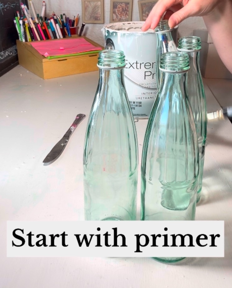 I always start by priming the bottles to create a smooth base and help the paint adhere better. A quick coat of primer makes all the difference, especially if the bottles have a shiny surface. Let the primer dry completely before moving on.