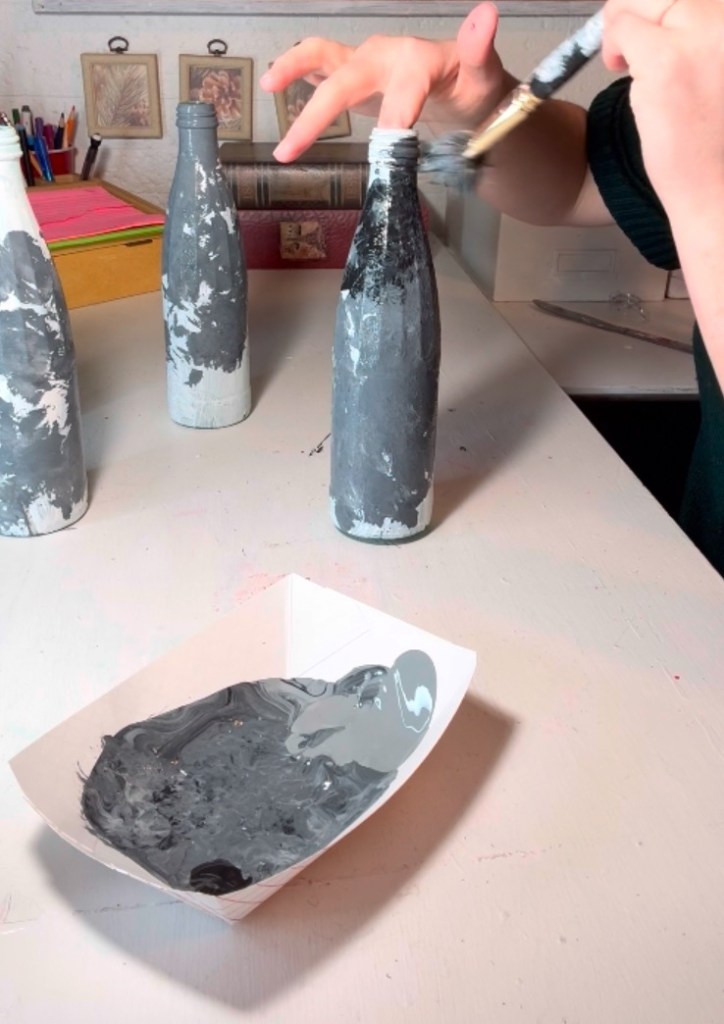 For this project, I decided to experiment with a marbled, splotchy design. Using gray, light gray, and black acrylic paints, I randomly dabbed and blended the colors across the bottles with a sponge. The effect was abstract and modern, giving each bottle a unique texture. Let the paint dry thoroughly before proceeding.