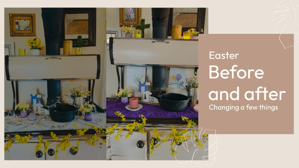 One final change I made was letting go of my pastel Easter lights. They just didn’t match the cozy, warm Easter vibe I was going for this year, so I decided to keep things simple and let the rich purples and bright yellows shine on their own.