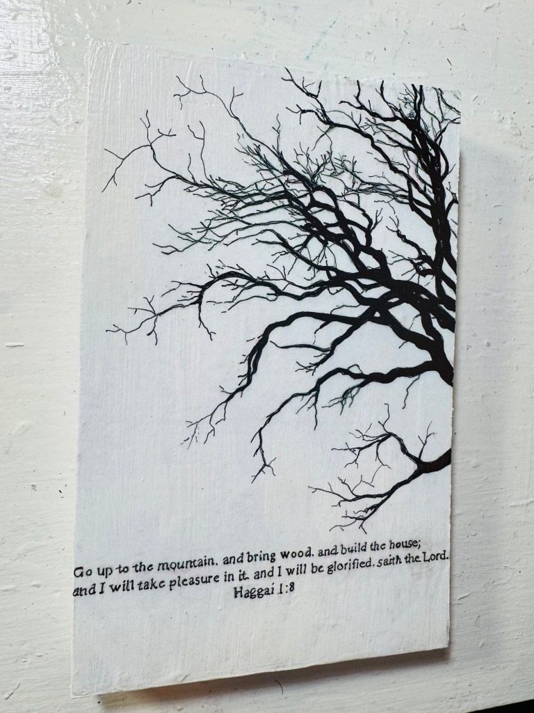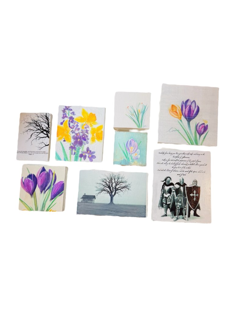 Out of the 8, 5 turned into wall hangings, and 2 were chunkier block pieces—perfect for tabletop displays or shelves. I also had a stack of pretty floral pictures I had printed out a while ago just sitting in a drawer. I didn’t want them to go to waste, so I measured and cut the junk wood to fit them just right.
