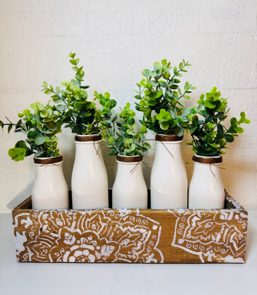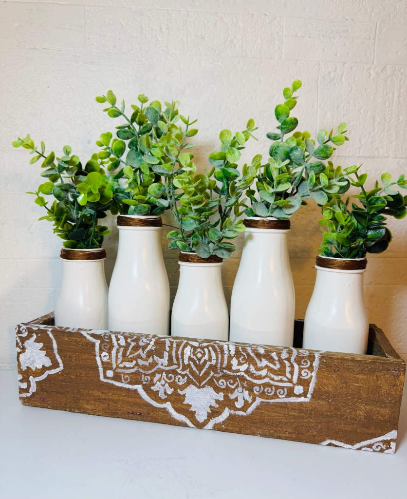 I added some faux greenery to each bottle, just simple stems I had on hand. Once I placed the bottles in the wooden box, everything came together. It looked like a beautiful centerpiece straight out of a boutique!