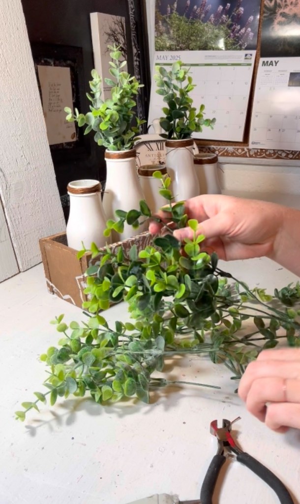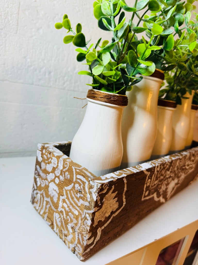 This would make a perfect centerpiece for a farmhouse kitchen table, an entryway, or even a shelf. Plus, it’s totally customizable—try different stencils, bottle colors, or seasonal greens to switch it up!