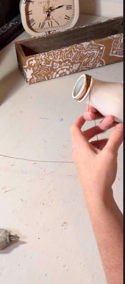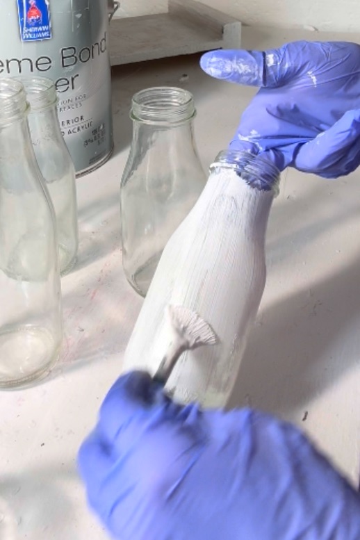 I had five empty Starbucks glass coffee bottles just waiting for a purpose. I painted them white to match the box, then wrapped some brown string around the tops for texture and a little extra rustic touch. I secured the string with hot glue—easy and quick!