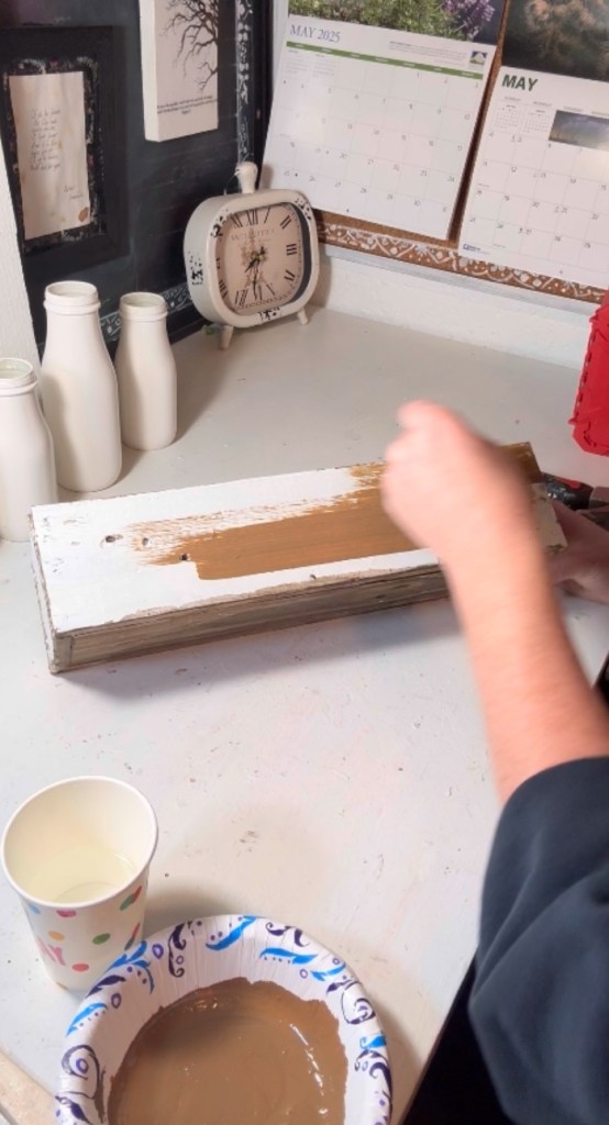 So, I gave it a coat of white paint. But you know how that sometimes goes—it ended up feeling too white, too new, not quite the warm rustic look I was after. So I grabbed some brown paint and layered it over.