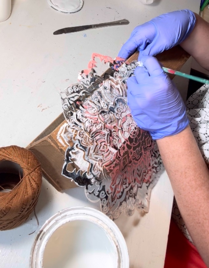 To add some charm and texture, I used a stencil to paint a cute white design on the box. Just a little detail, but it made such a difference. It softened the piece while still letting the layered wood tones show through underneath.