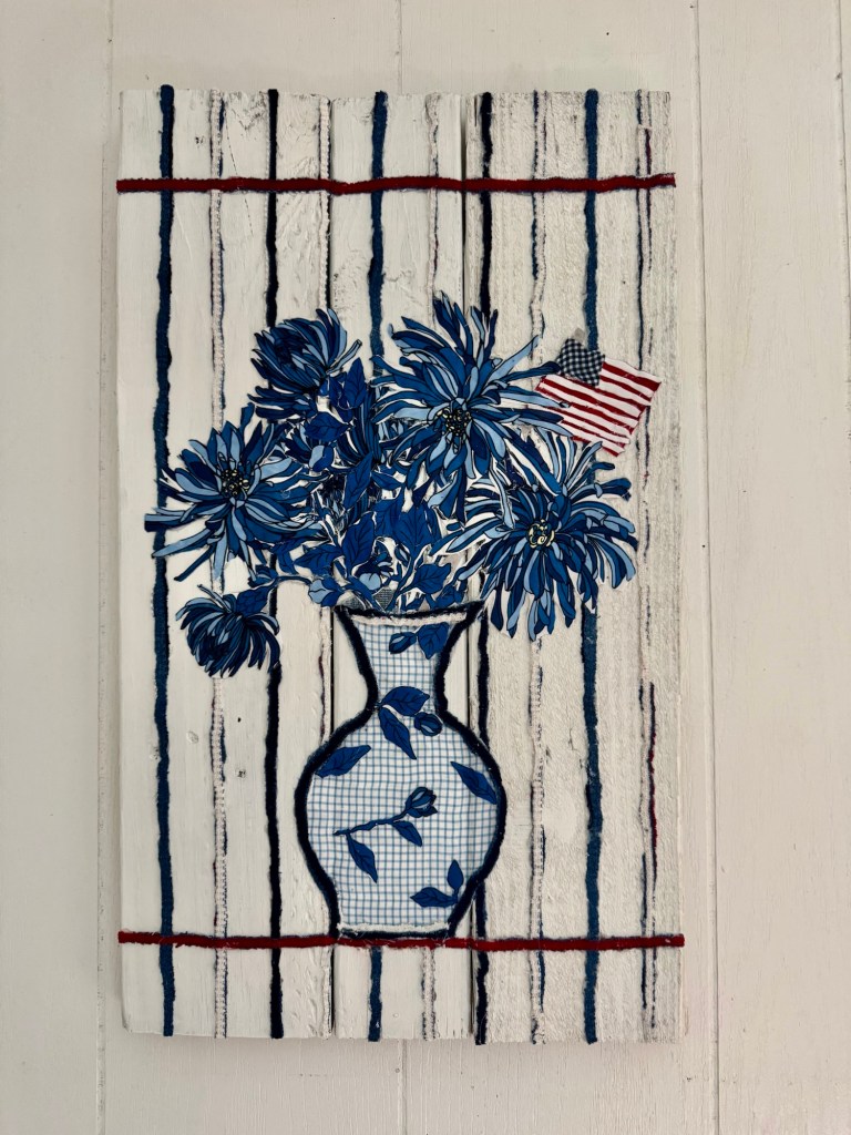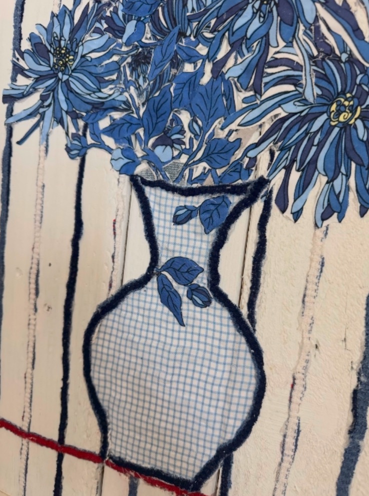 Next, I cut a vase shape out of a light blue shirt and glued it right in the center. I loved how it looked… until I made a mistake while trimming the shape and had to cut it again, leaving an awkward line on the vase that didn’t look great. I was a little discouraged, but I kept going.
