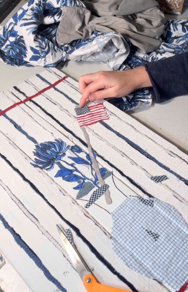 I have a huge stash of old clothes—torn, stained, outgrown, you name it. Among them was a striped patriotic shirt, perfect for setting the tone. I cut it into strips and hot glued them across the background like rustic red and white stripes.