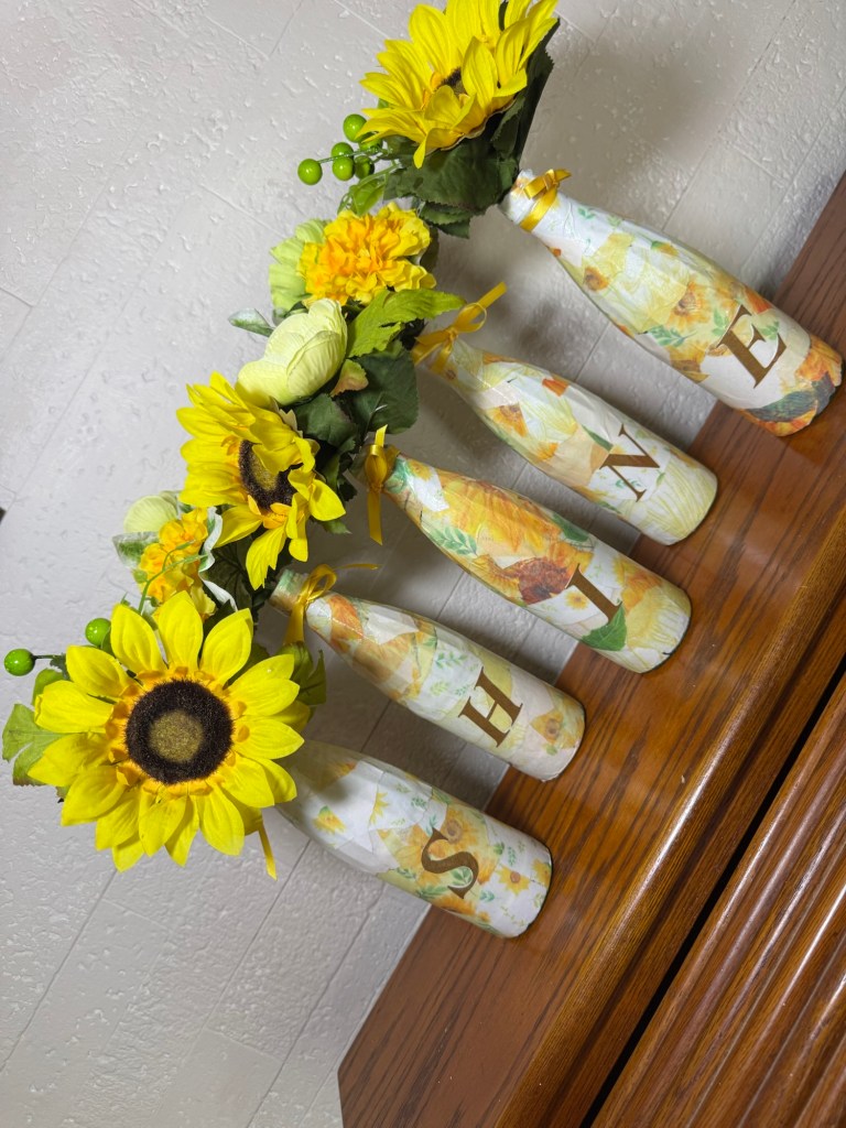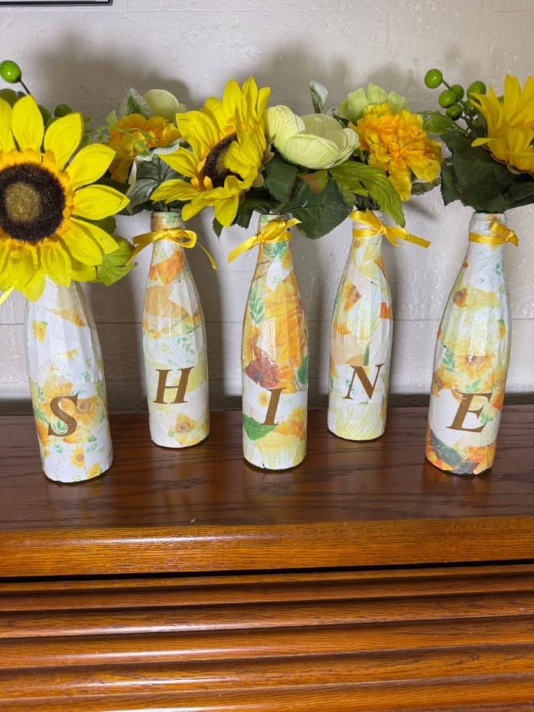 Five empty glass bottles (any shape or size works!) Sunflower-themed printable paper (I found mine on Pinterest and printed it off) The word โSHINEโ printed and cut out (1 letter per bottle) Matte Mod Podge Hot glue gun Raffia or twine for bows Faux sunflower stems or floral picks