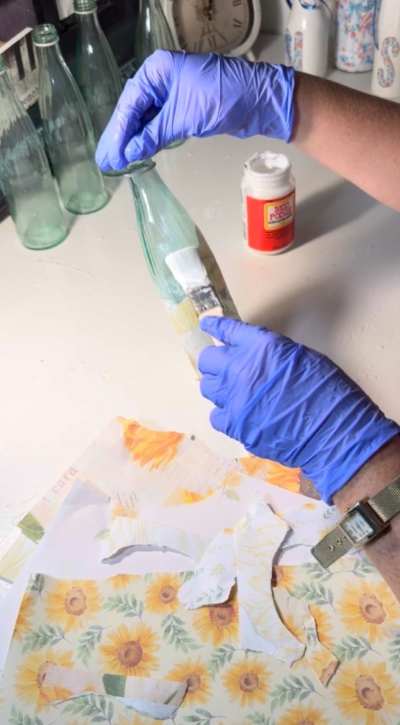 Clean and dry the bottles. I started with five junk bottles I had saved โ (sparkling water bottles.) After removing the labels and cleaning them well, they were ready to be transformed. Apply the sunflower paper. I found a beautiful sunflower print on Pinterest, printed it on standard printer paper, and I just tore into peices.