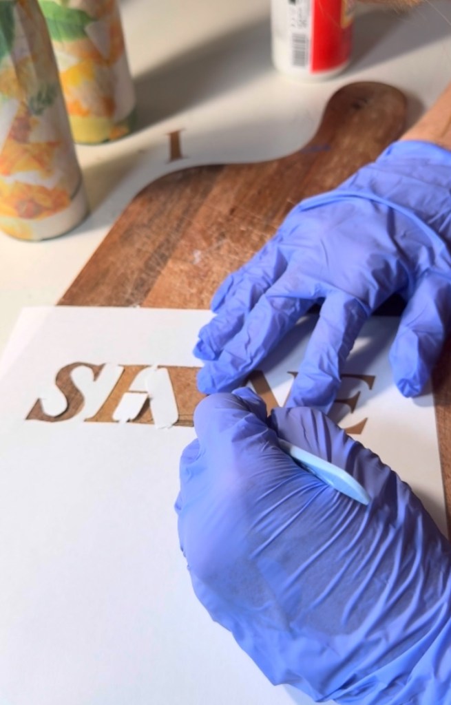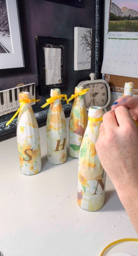 Add the lettering. I printed the word SHINE, one letter per bottle, in a bold font and carefully cut out each letter with a scalpel for clean edges. I Mod Podged each letter over the sunflower print โ one per bottle โ spelling out S-H-I-N-E across the set.
