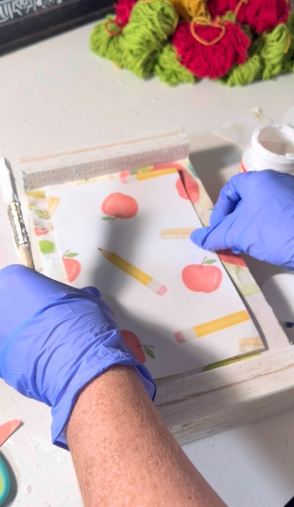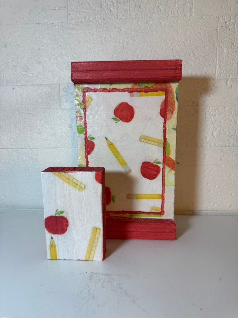 I had some leftover junk wood from previous projects, so I gave it new life with some school-themed Mod Podge magic. I printed out papers with apples, pencils, and rulers, then layered them onto the wood pieces with Mod Podge. I also painted around the edges with red paint to make the colors pop. These are great to tuck onto bookshelves or use as small standing signs.