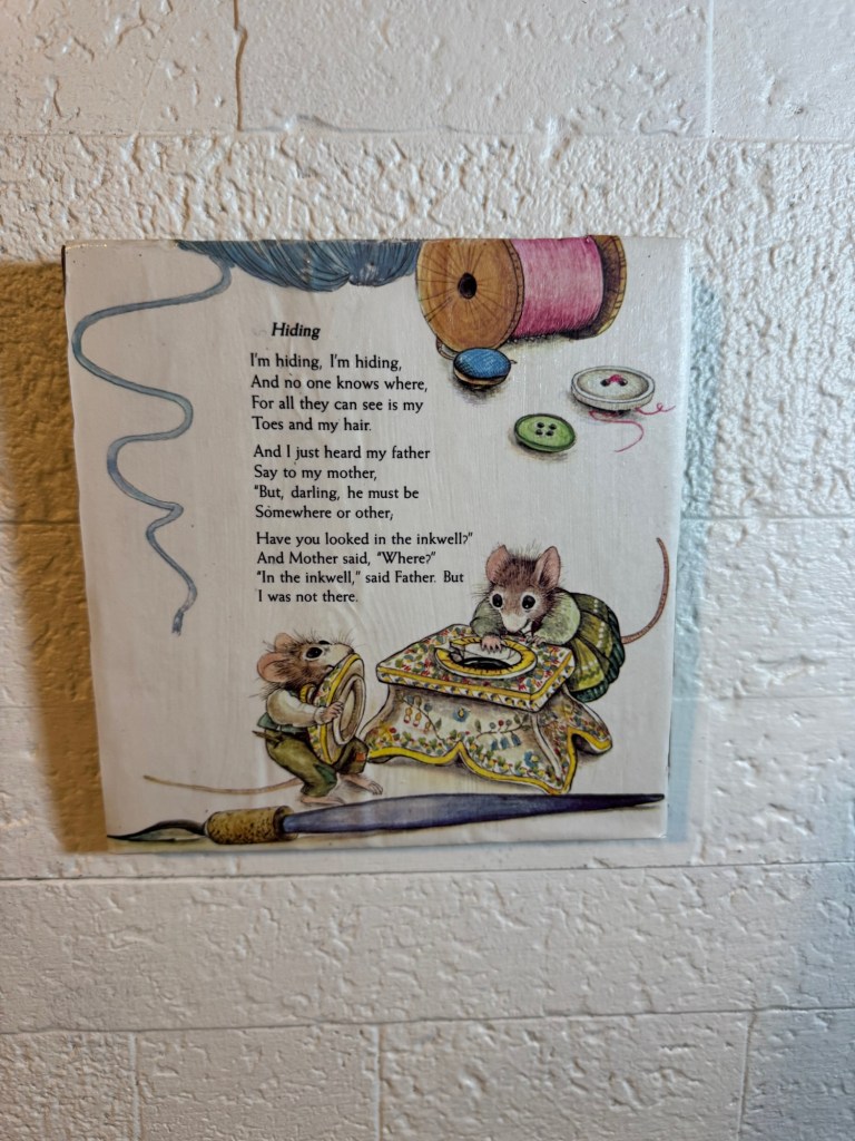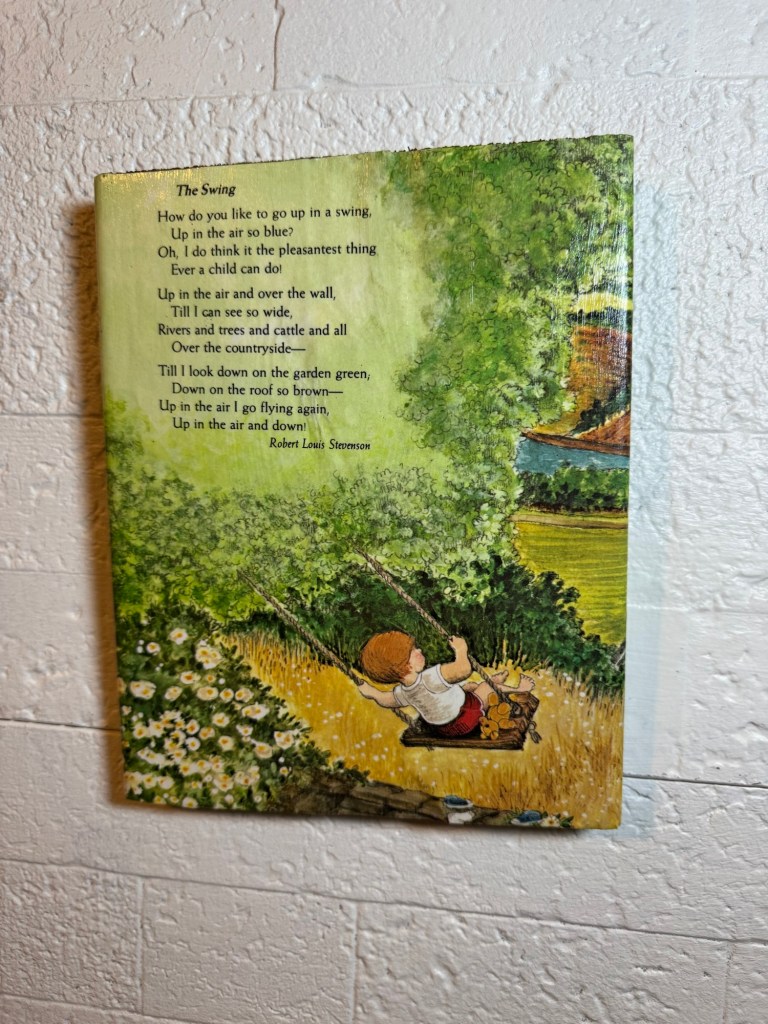 I also found a book of children’s poems and picked out two that I really loved. I cut them out and Mod Podged each one onto another piece of scrap wood. Then I added a little hanger on the back so they can be hung or leaned on a shelf. They’re sweet,