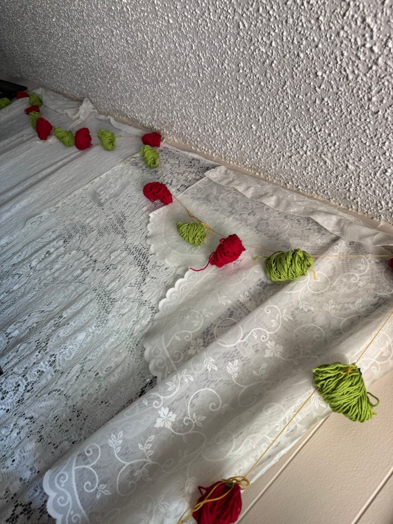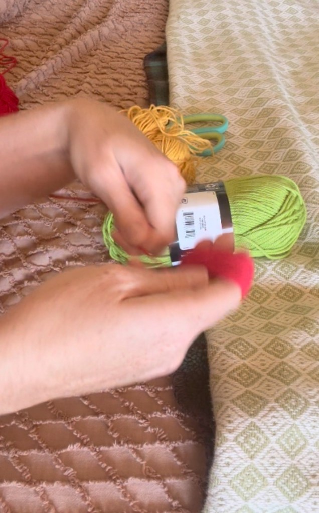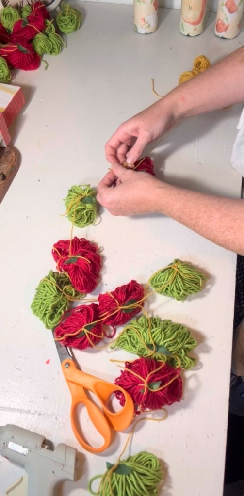 Next, I made a fun little apple garland! I took red yarn and rolled it into small balls, then tied the top with brown yarn to look like a stem. For the leaves, I cut out a green fabric and hot glued it to the top of each yarn apple.