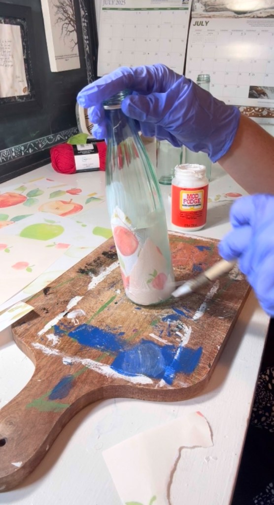 I started by making three cute bottle vases using empty glass bottles. I printed off some pretty apple-themed scrapbook paper and used Mod Podge to adhere the paper right onto the bottles. Each one is slightly different, which gives them character.