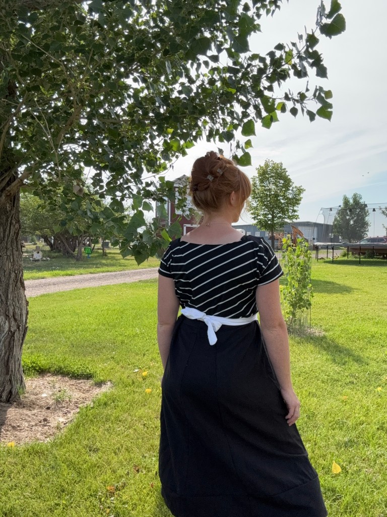 I attached the top to the skirt and left a little gap at the waist for the wrap tie to slide through. I made the tie out of sturdy white cotton—it ties in the back and the white matches nicely with the striped back and the floral front, which both have black and white in them.