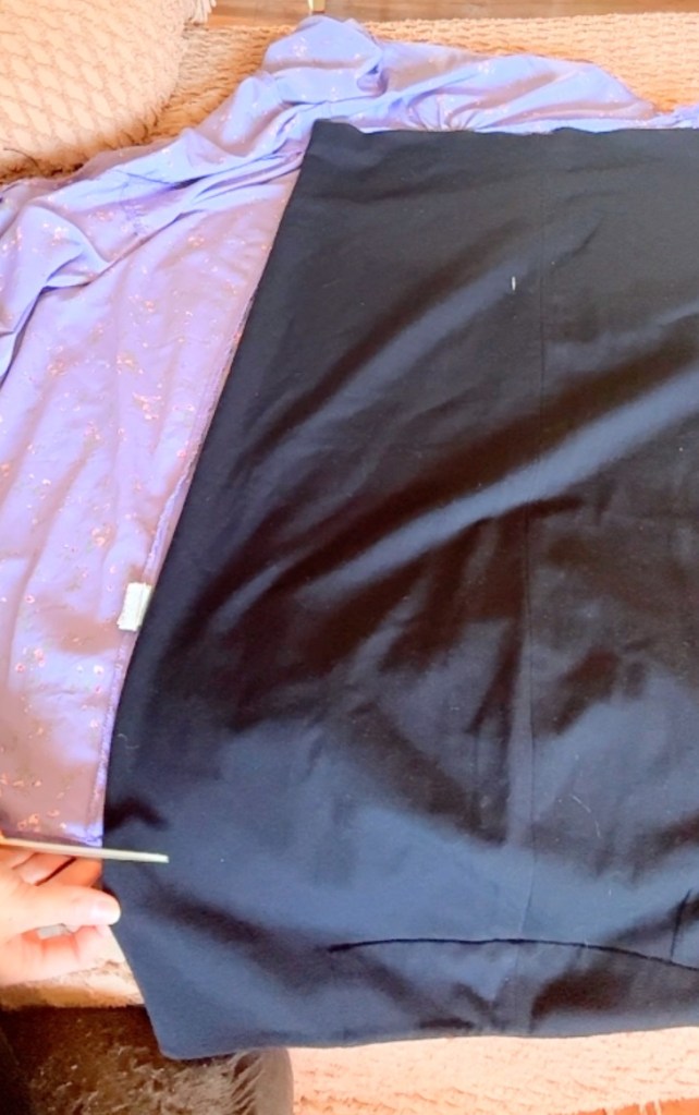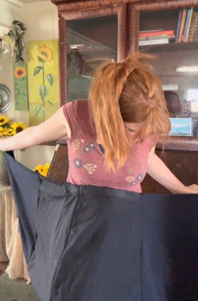 Then, for the middle panel of the skirt, I pieced together my husband’s torn dress pants. I cut them down and rearranged the fabric to make them work.