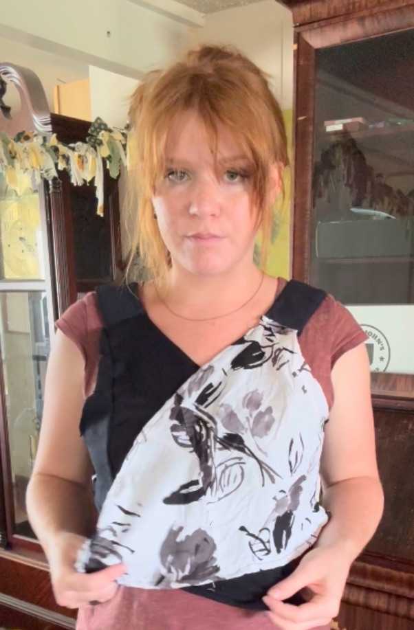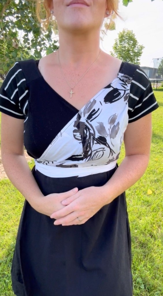 The front was a bit more of a challenge. The wrap design is sort of a triangle shape, so I made one side out of the black sweatpants and the other side out of the floral dress—because that’s all I had fabric for. Not a perfect match, but honestly, it added character.