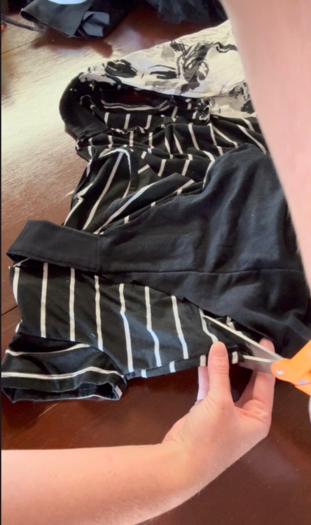 A long black skirt that had a paint stain, a ripped zipper, and tears throughout. My husband’s old black dress pants—ripped hems, torn seams, busted pockets. A worn-out striped midi dress. A torn floral dress that I had already cut up for other projects. And a pair of black sweatpants that were super pilly and peeling.