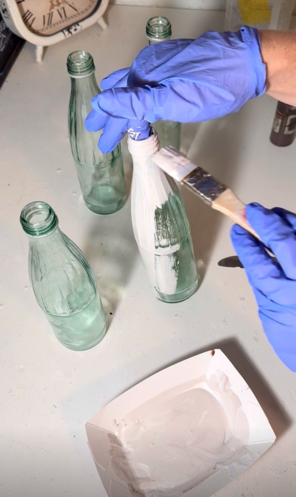 First, I gave the bottles a good clean and then painted them a creamy, neutral color. I love starting with a light background because it makes the autumn colors pop.(I also had to use three coats of paint).