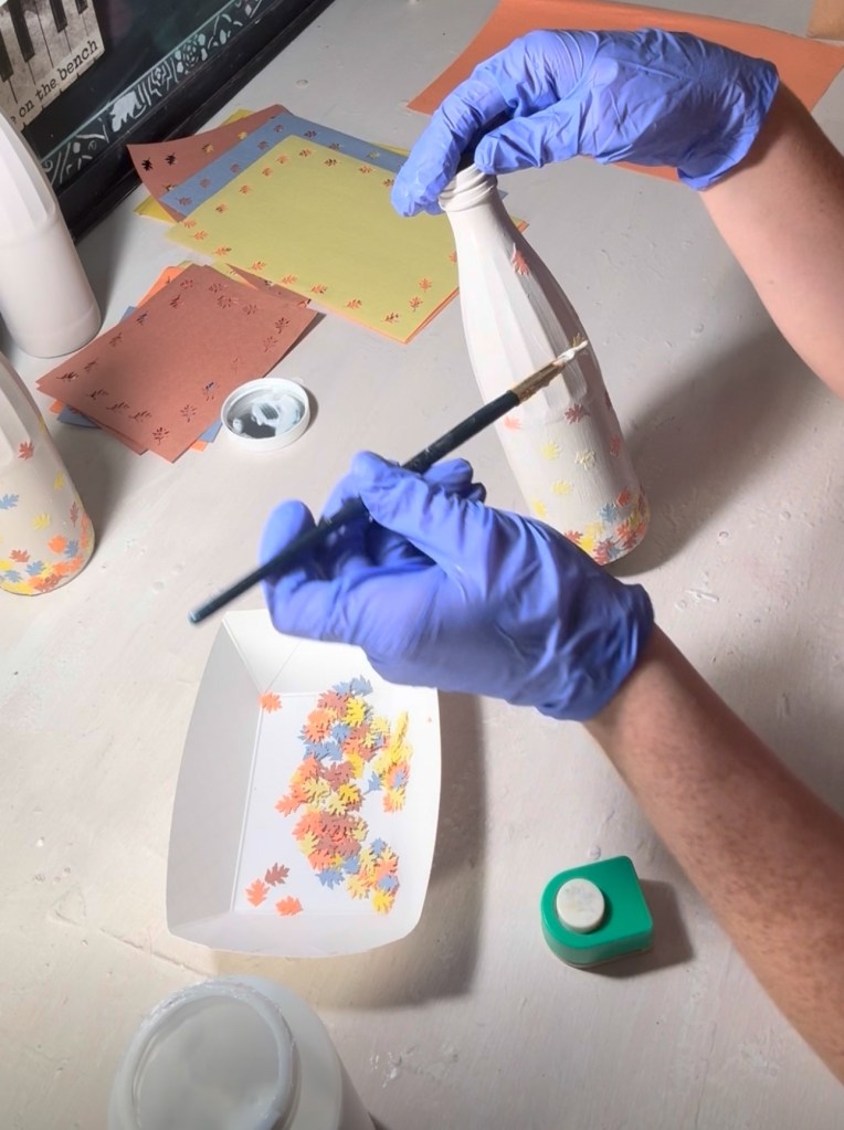 Using my tiny leaf paper cutter, I punched out little paper leaves from fall-colored cardstock. Then, with Mod Podge, I clustered some leaves toward the bottom of each bottle and let a few “fall” upward in a scattered pattern. It created the sweetest cascading leaf effect.