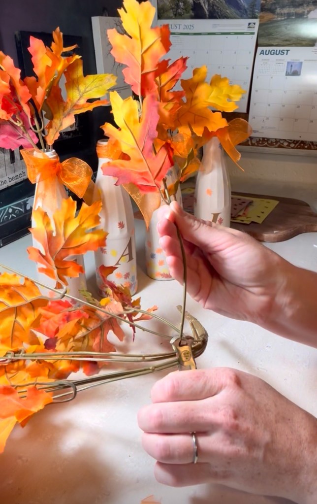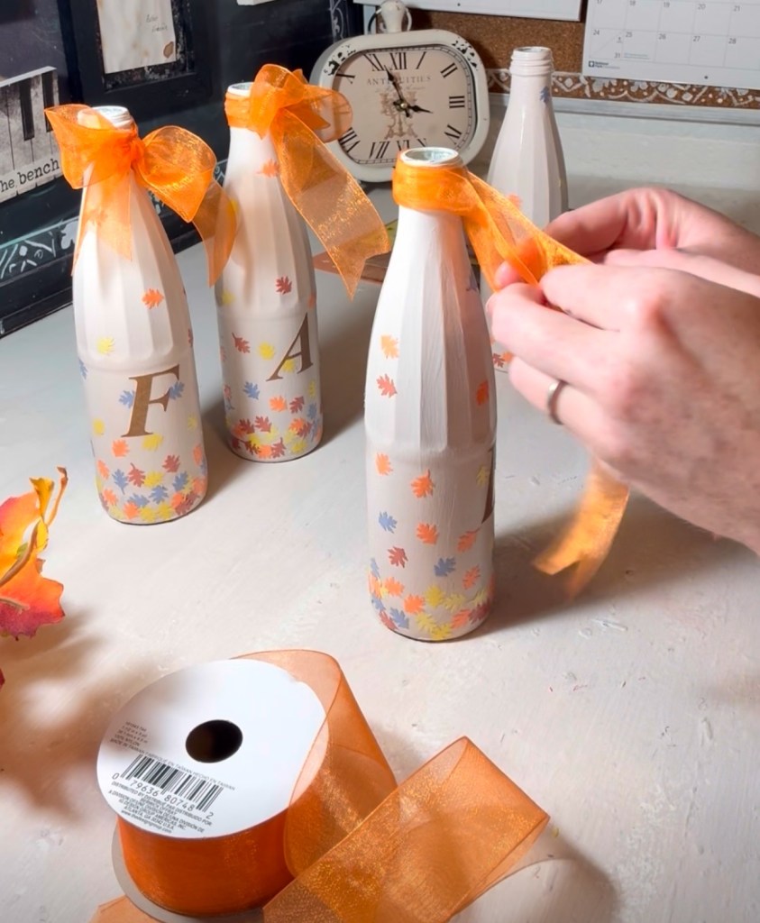 At the top of each bottle, I tied an orange bow for a pop of color. I also added a few faux orange leaves and fall floral picks so the bottles could double as mini vases. The texture and color on top balance the soft cream below perfectly.