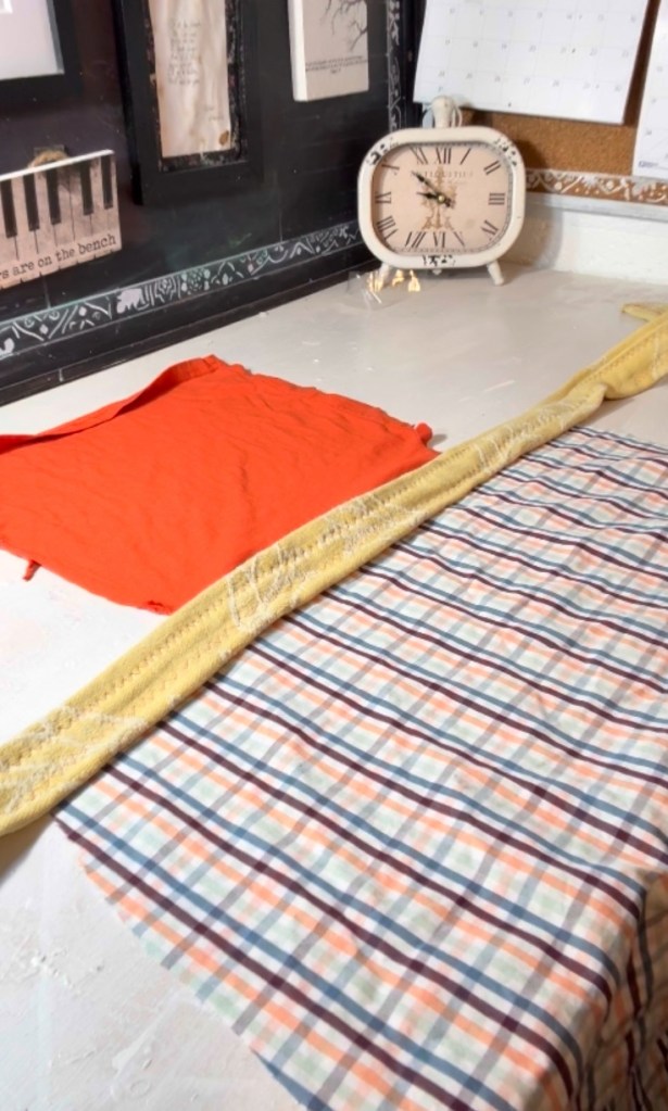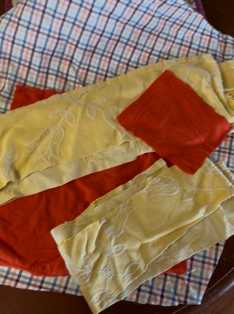 I had an apron I liked and used that as my “pattern.” I didn’t go out and buy fabric—just grabbed some old clothes that had nice autumn tones and textures. It felt good to repurpose something instead of letting it sit in the back of my closet.