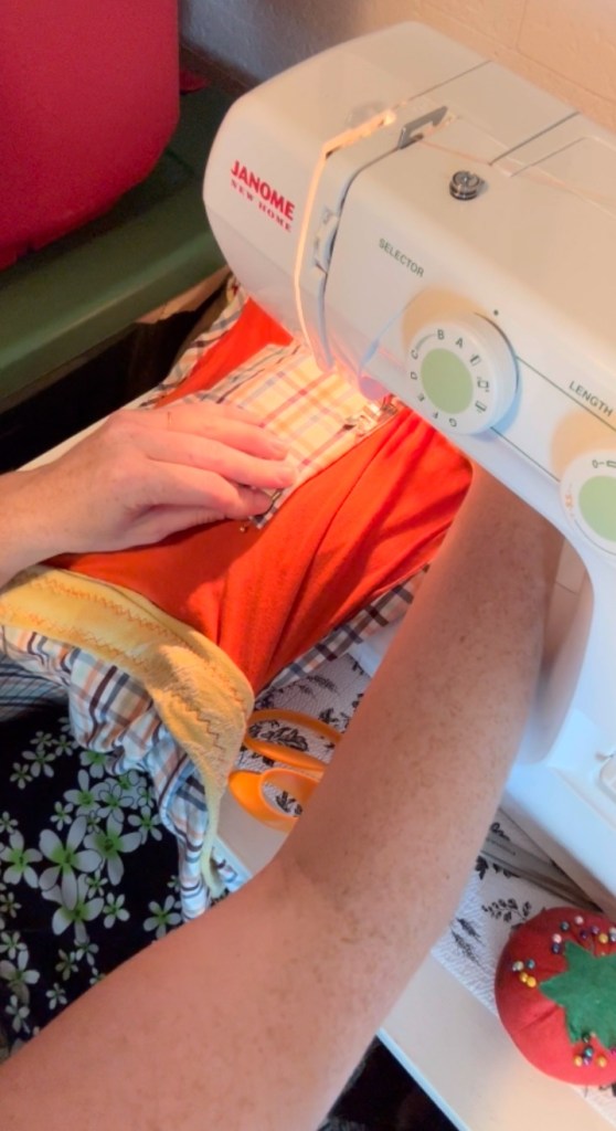 I laid my old apron flat and cut around it to get the general shape, then pieced together fabric scraps from my clothes. The stitching part? Let’s just say I’m not a pro sewer by any means. My lines aren’t perfect, the seams have some quirks, and there are definitely spots I’d redo if I could. But that’s the beauty of a DIY project—it doesn’t have to be perfect to be useful.