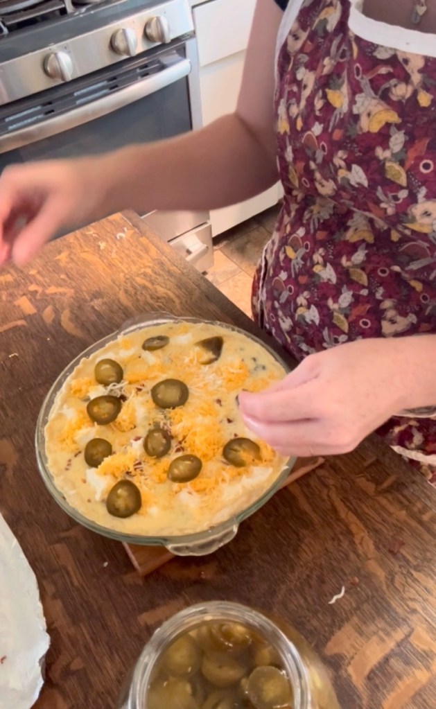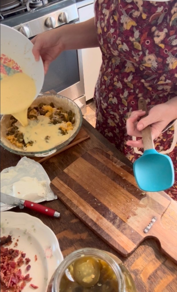 Sprinkle the chopped canned jalapeños directly on the bottom of the pre-baked crust. Add half the cheddar, mozzarella, and bacon. Dot with half the cream cheese cubes. Whisk eggs, cream, garlic powder, salt, and pepper in a bowl, then pour over the filling. Top with remaining cheeses, bacon, jalapeños, and cream cheese. Add a few sliced jalapeños on top for decoration.