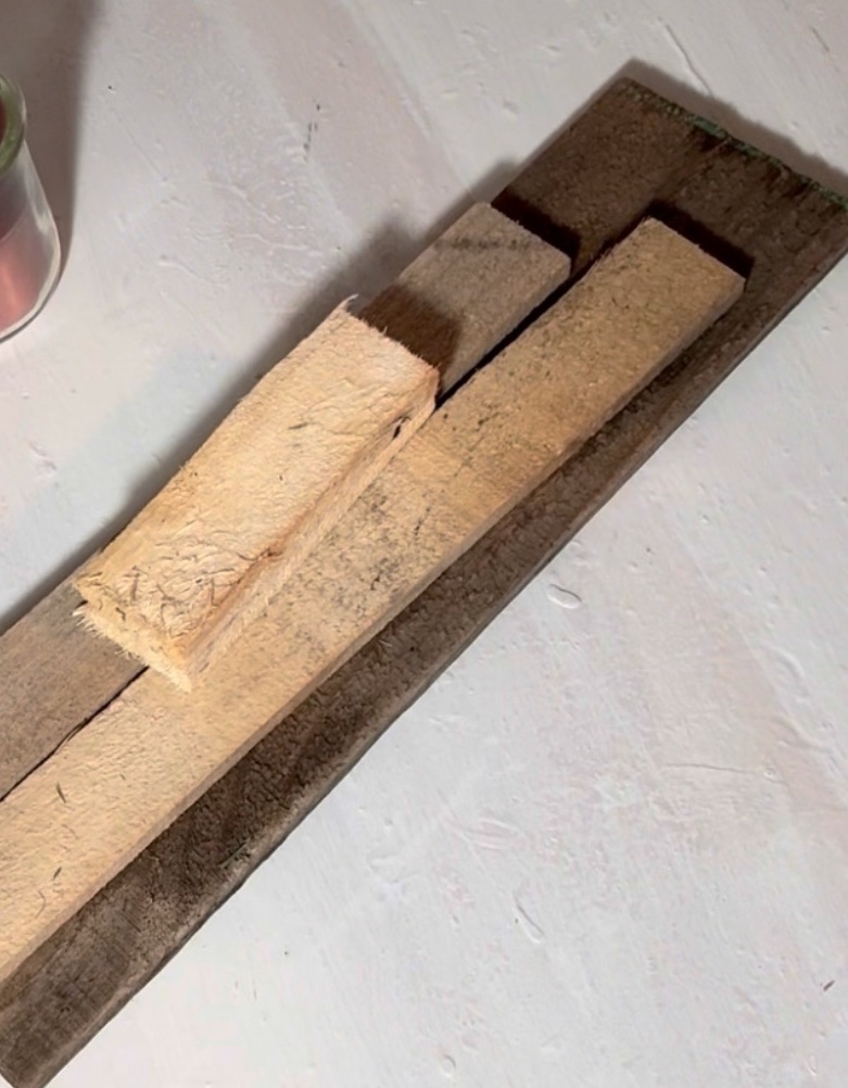For the tray, I grabbed a long piece of pallet board that could fit all five candles side by side. To make sure the candles wouldn’t slide off, I nailed on some thin pallet scraps/wood shims around the edges.