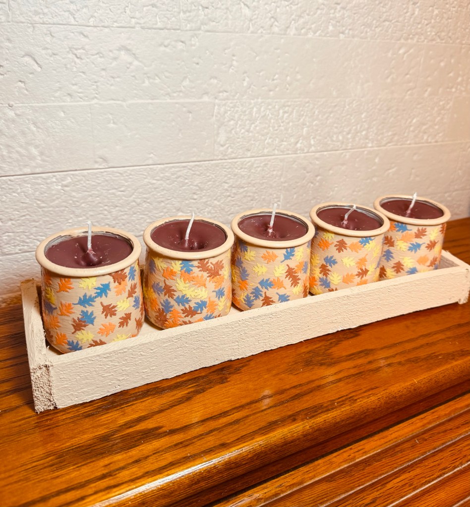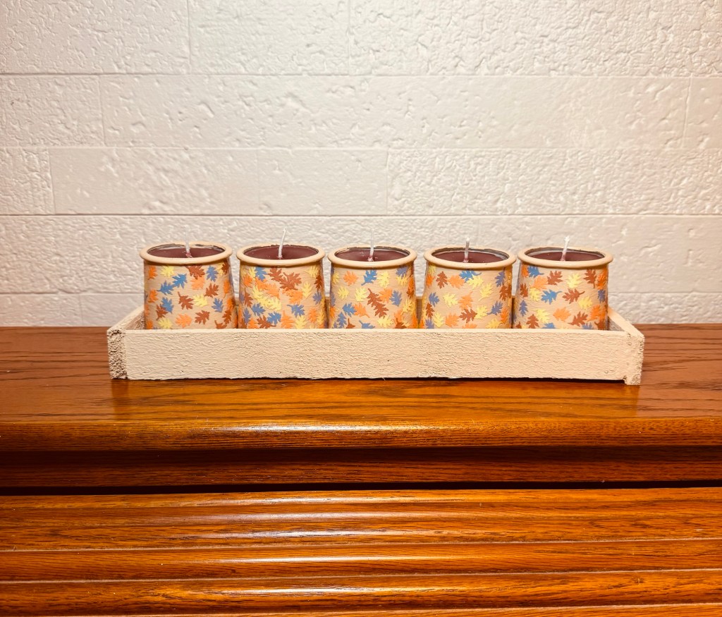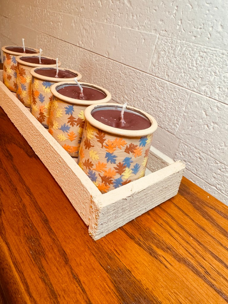 5 small yogurt wheat jars (or any glass jars you’ve saved) Leftover candle wax (from nearly finished candles) Scrap pallet board + wood shims (for the tray) Tan acrylic paint Paintbrushes Paper leaf punch Fall-colored scrapbook paper (yellows, oranges, browns) Mod Podge Nails and hammer (or wood glue if you prefer)
