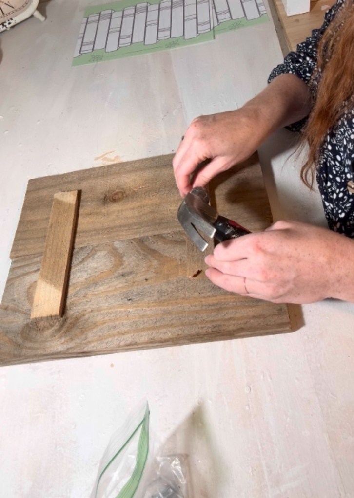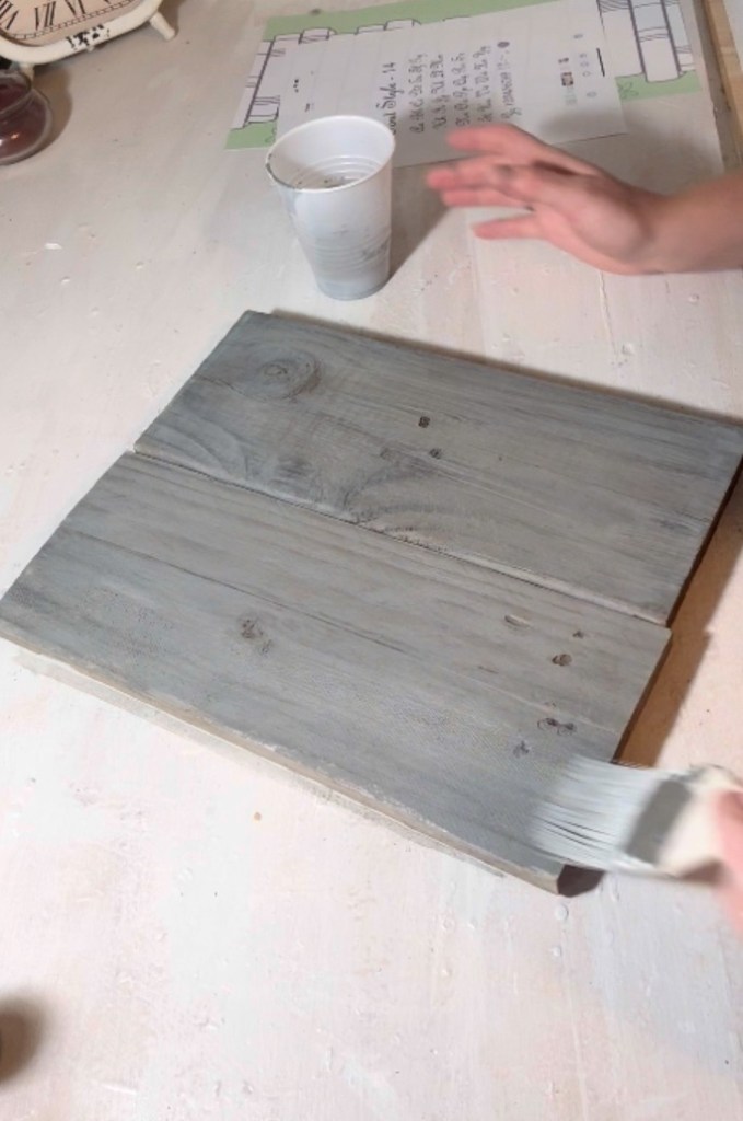 I took a few leftover pieces of junk wood and nailed them together to form a rectangle-shaped sign. To give the wood a softer, more finished look, I painted it with a light gray wash—just enough to let the wood grain peek through.